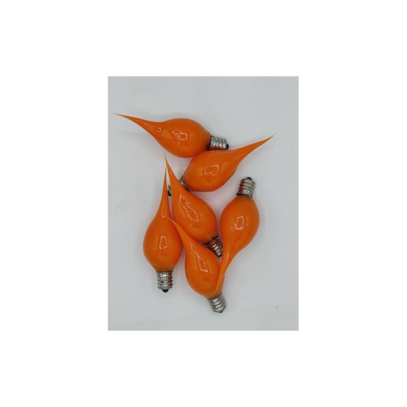 These are our Orange silicone light bulb. They go perfect in any primitive or country home. They give off a nice warm glow and the silicone makes them look like a real candle when lit. The bulbs look amazing on or off and are orange in color. These are candelabra base which mean they fit in small socket night lights, candle holders, and chandeliers. They have an extra long 3000 hour life and are hand dipped in the USA.