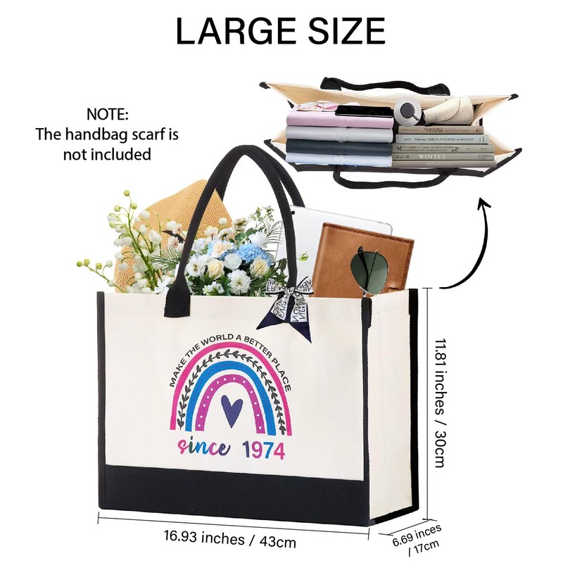 - Perfect 50th Birthday Gift Idea: Turning 50 is a major milestone, and our boho canvas tote bags capture the essence of this special occasion perfectly. Our vintage birthday themed tote bags are designed with the charming phrase "MADE THE WORLD A BETTER PLACE SINCE 1974" and cute rainbow pattern, making them the best 50 years old birthday gifts. They're not just reusable large 50th birthday gifts bags– they're cherished turning 50 keepsakes that celebrate a lifetime of making the world brighter.