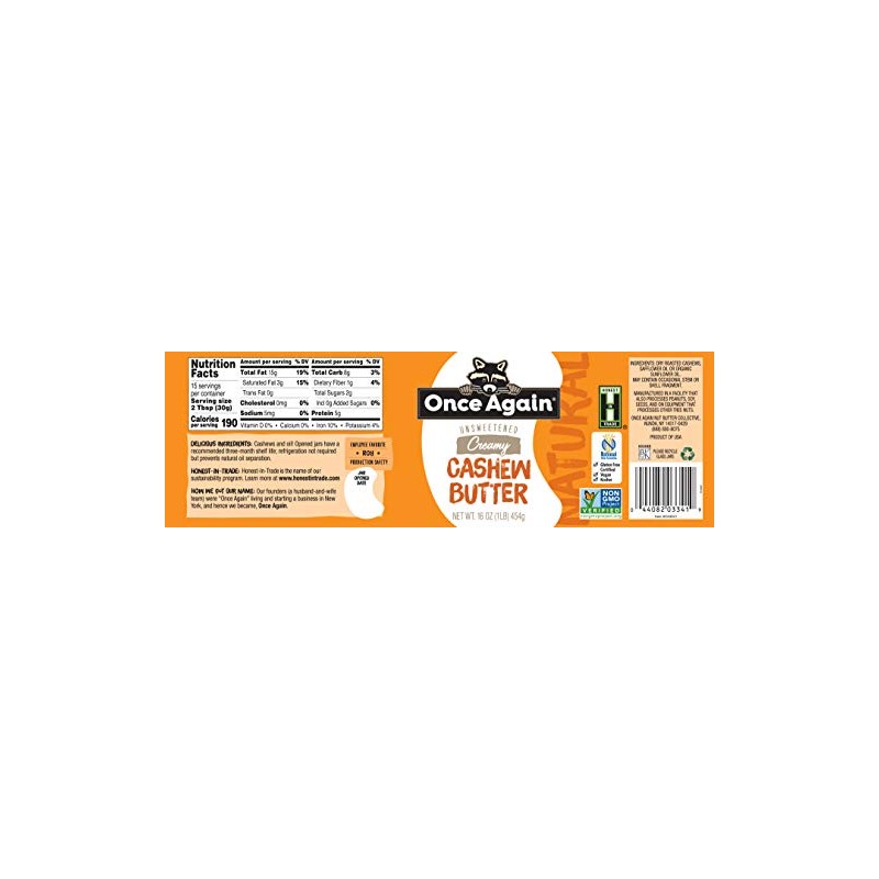 - CREAMY CASHEW BUTTER || 16 oz deliciously creamy, natural cashew butter. Our cashew butter is made with the finest cashews that are dry roasted and milled smooth. Made in a peanut-free facility. Manufactured in a facility that also processes soy, sesame seeds, and on equipment that processes other tree nuts