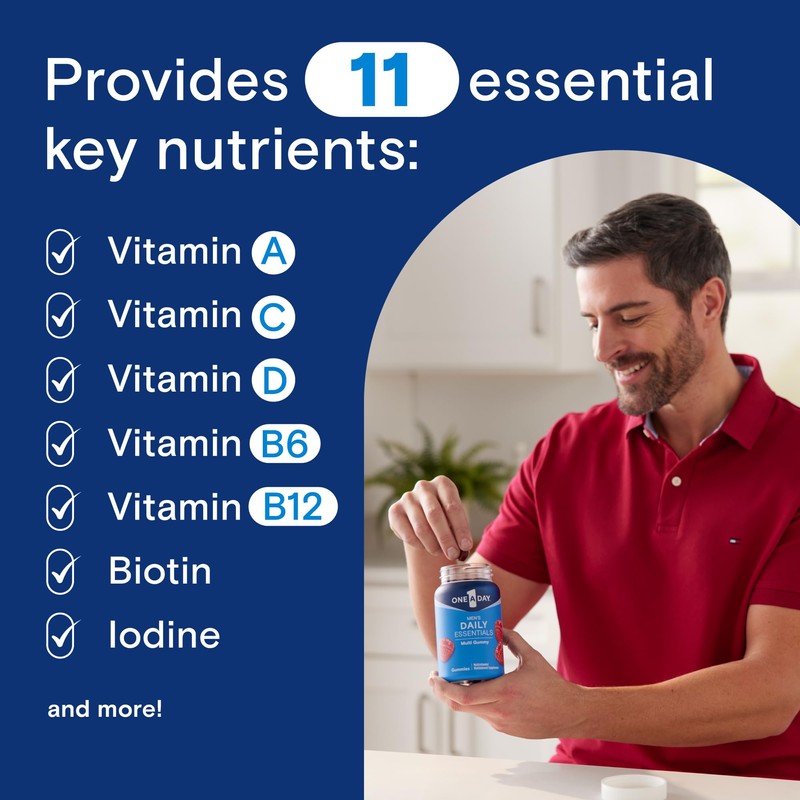 - From the #1 multivitamin brand specially designed for men: One A Day Men's Daily Essentials multivitamin for men gummies have11 key nutrients that include Vitamins A, C, E, healthy muscle function and immune health with Vitamin D*