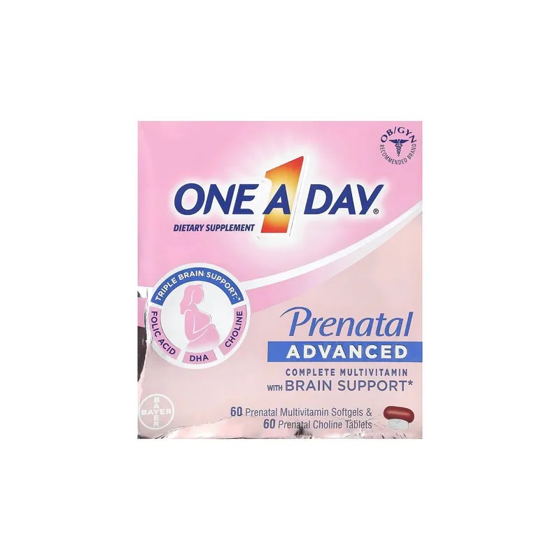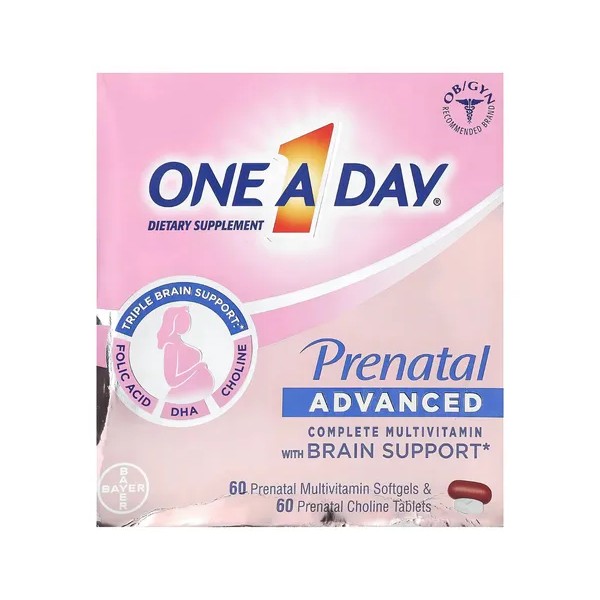 One A Day Prenatal Advanced es el único multivitamínico prenatal para mujeres que tiene una combinación única de 3 elementos esenciales para el desarrollo del cerebro: ácido fólico, DHA y colina, para nutrir el área del cerebro asociada con el aprendizaje y la memoria, junto con vitaminas A, C, D, E, hierro, tiamina, niacina, B6, calcio, zinc, magnesio y más.*