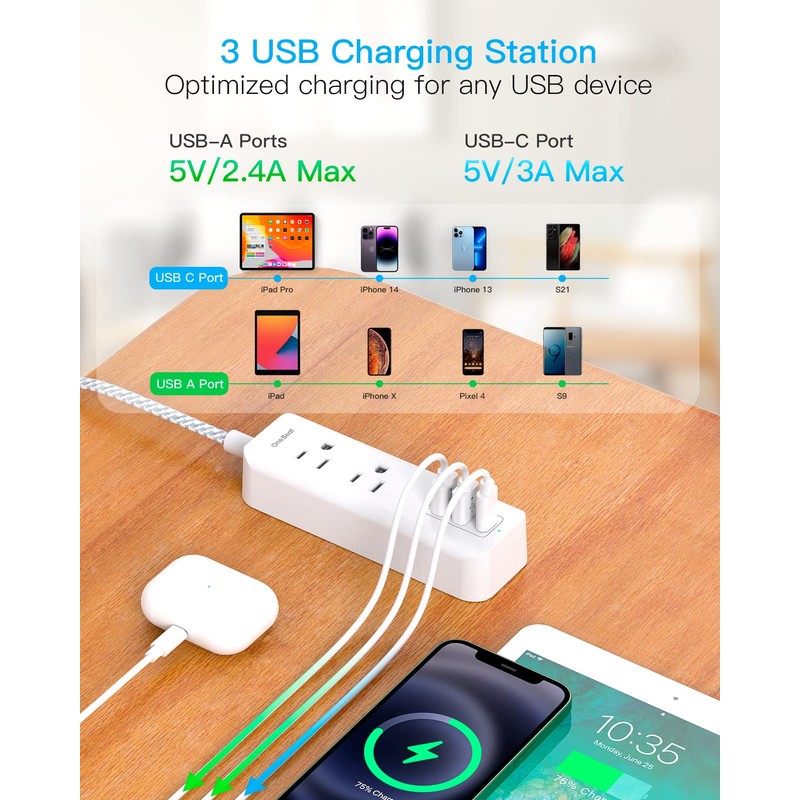 - 【USB C FAST Charge】 The mini power strip has 3 usb ports, USB-C port provides 5V/3.0A/15W fast charging, each USB-A port can intelligently charge up to 5V/2.4A.