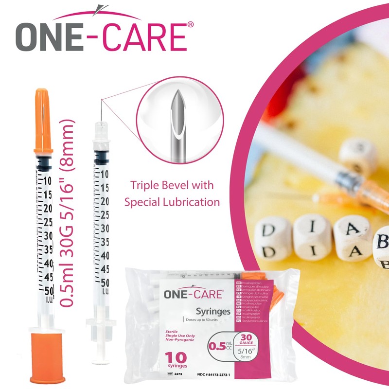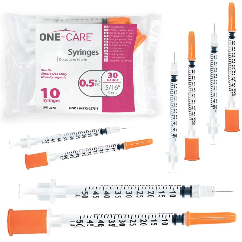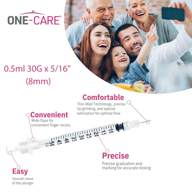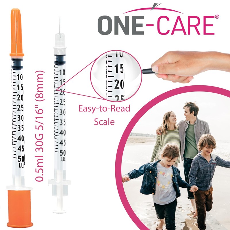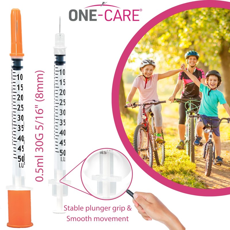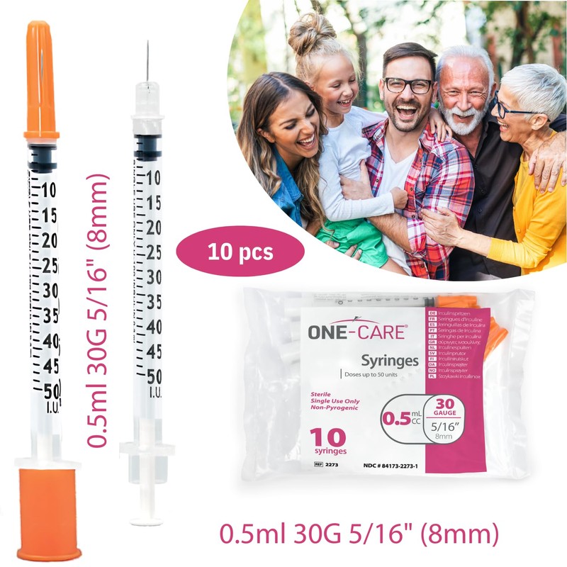 ONE-CARE Syringes 0.5 ml/cc, 30G x 5/16"(8mm), Orange Cap, 10 pcs/bag