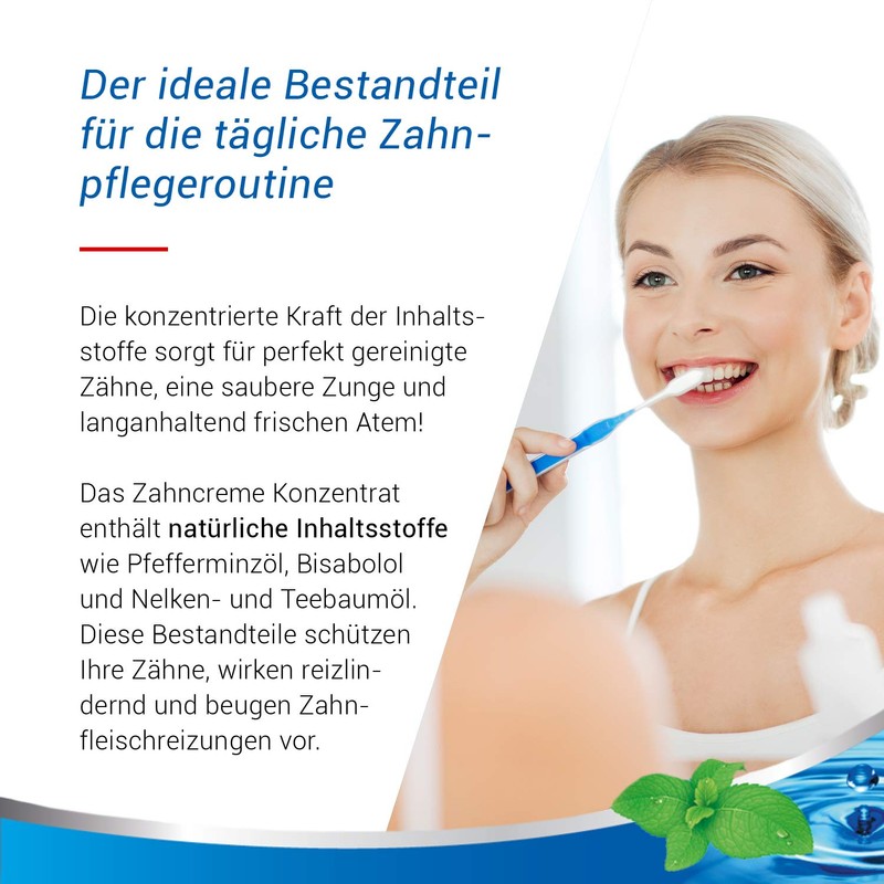 - High yield: the effective ingredients are contained in increased concentration, so that only a small amount is necessary for thorough cleaning. This makes the concentrate up to 5 times more efficient than conventional toothpaste.