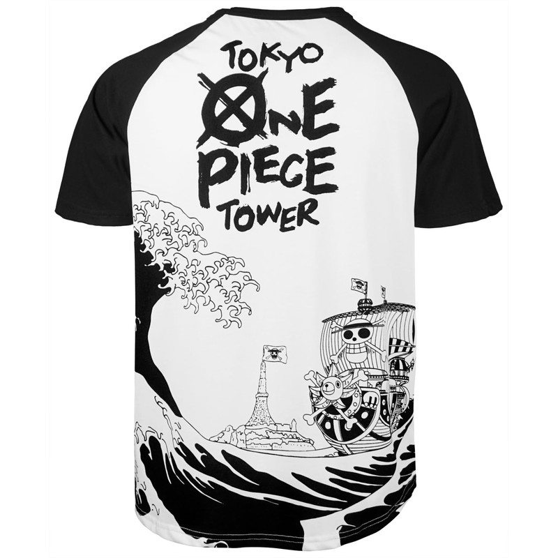 One Luffy Piece Thousand Sunny Pirate Ship Ruffy Large Wave Off Kanagawa Japanese Anime 100% Heavy Cotton Raglan Baseball Men's T-Shirt, (Short-sleeved) black/white