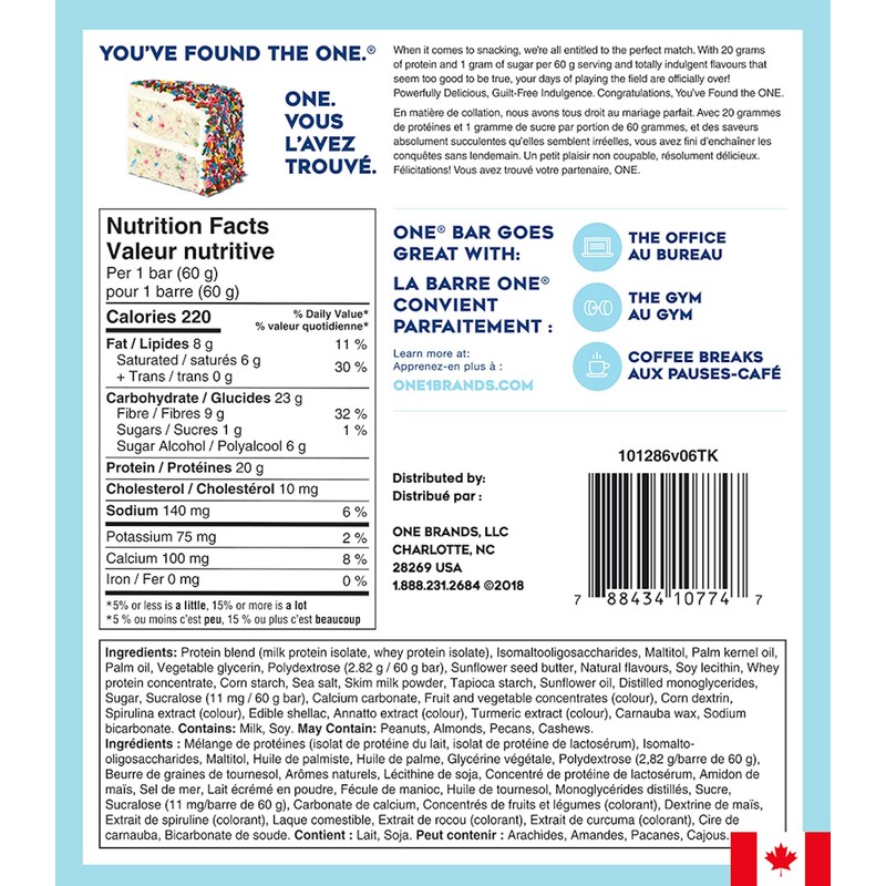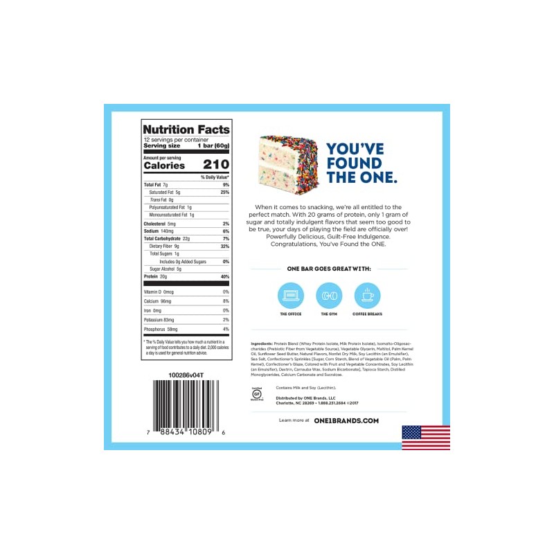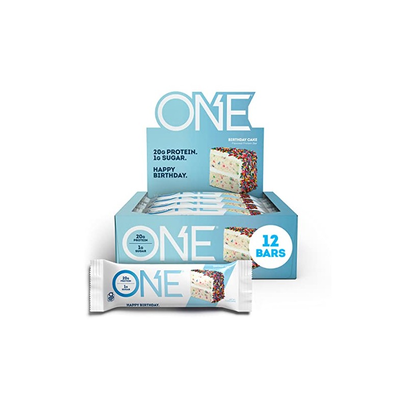 - THE ONE PROTEIN BAR: Congratulations, You've Found the ONE. Protein bar, that is. With our Gluten-Free Birthday Cake protein bar, everyday is a celebration. Satisfy your sweet tooth with 20g of protein and just 1g of sugar.