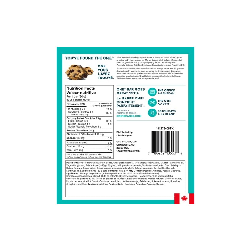 - THE ONE PROTEIN BAR: Congratulations, You've Found the ONE. Protein bar, that is. Our Chocolate Chip Cookie Dough protein bar tastes like the guilty pleasure of eating cookie dough, but is Gluten-Free, with 20g of protein and just 1g of sugar.
