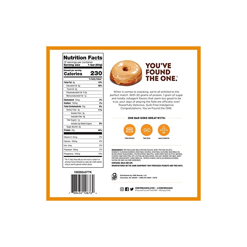 - THE ONE PROTEIN BAR: Congratulations, You've Found the ONE. Protein bar, that is. This Gluten-Free Maple Glazed Doughnut protein bar tastes as decadent as it sounds, but with 20g of protein and just 1g of sugar.
