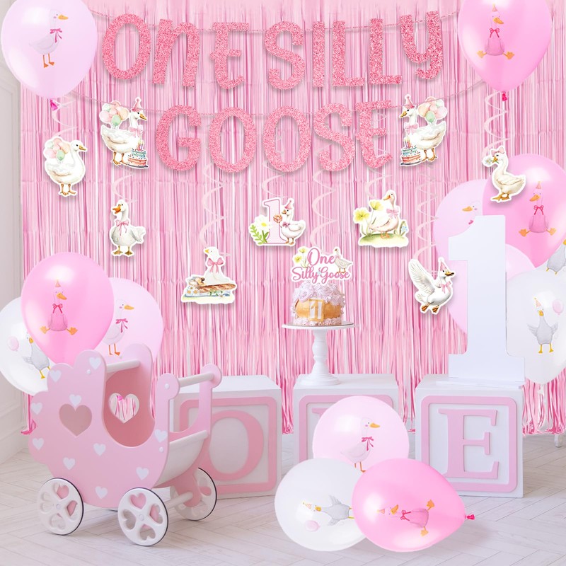 • 【Goose 1st Birthday Decorations】The one silly goose birthday decor set includes 1 pcs ONE SILLY GOOSE banner (Not Pre Strung), 1 pcs pink foil fringe curtain, 8 pcs goose hanging swirls (Not Pre Strung), 30 pcs goose balloons (10 for each color), goose decorations bring a joyful and warm atmosphere to your party