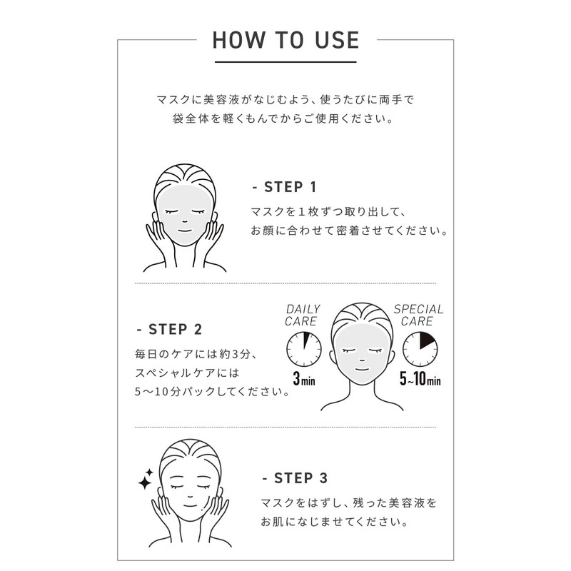 • How to Use: Lightly squeeze the entire bag with both hands before using so that it can blend with the mask. 1. Take out the mask one at a time and make it tight to fit your face. 2. Take about 3 minutes for daily care, pack 5-10 minutes for special care. 3. Remove the mask and let the remaining serum blend into your skin