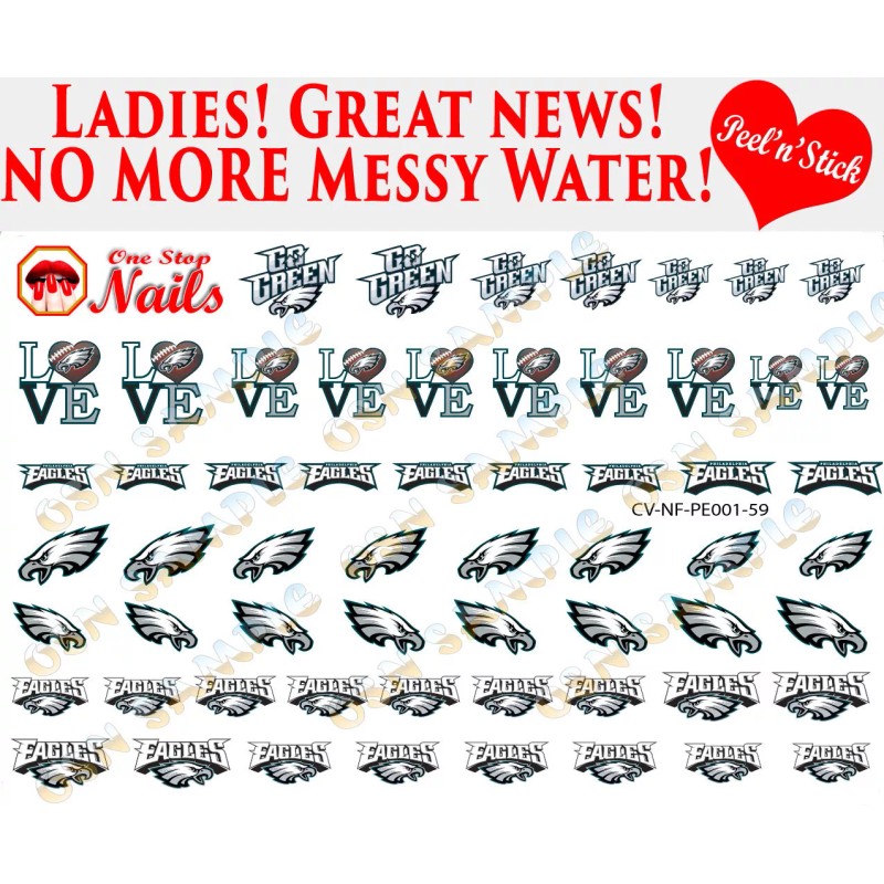 For Philadelphia Eagles fans: Top Quality Bright and Colorful Set of 59 Clear Vinyl PEEL and STICK (NOT Waterslide) nail decals/stickers. Can be applied to any types of nails: Acrylic, Any type of Gel, Regular Nail polish. Looks best on white or lighter color nail polish.