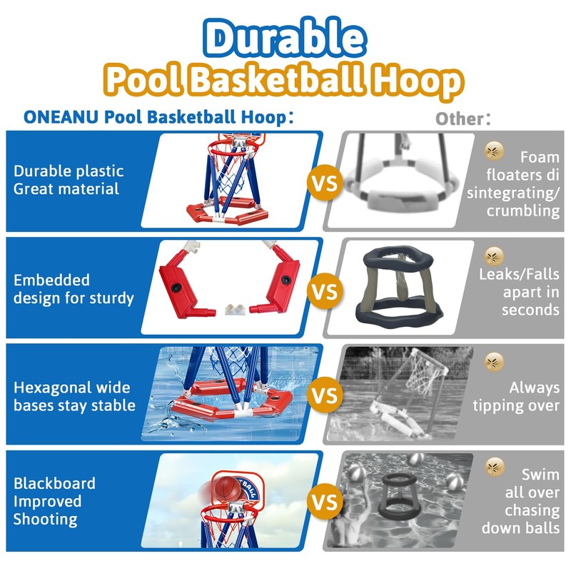 - 【Easy to Install In Seconds】ONEANU Floating basketball hoop for pool comes with detailed installation steps, no need tools. Poolside basketball hoops set it up in just a few minutes, perfect for impatient kids or last-minute pool parties