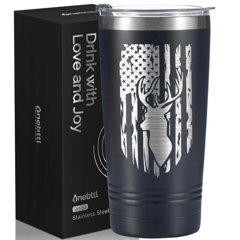 Onebttl Hunting Gifts for Men, Father's Day Gifts for Hunter Dad, Grandpa, 20oz Stainless Steel Tumbler, Spill-Proof Lid & Straw Included, Black - Laser Engraved Flag & Deer