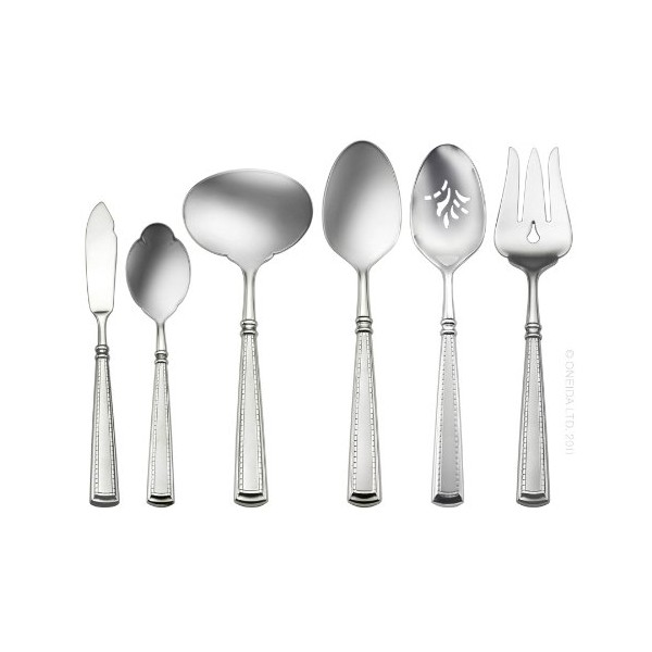 - 6-piece set includes: one each: serve spoon, pierced serve spoon, serve fork, gravy ladle, butter knife and sugar spoon