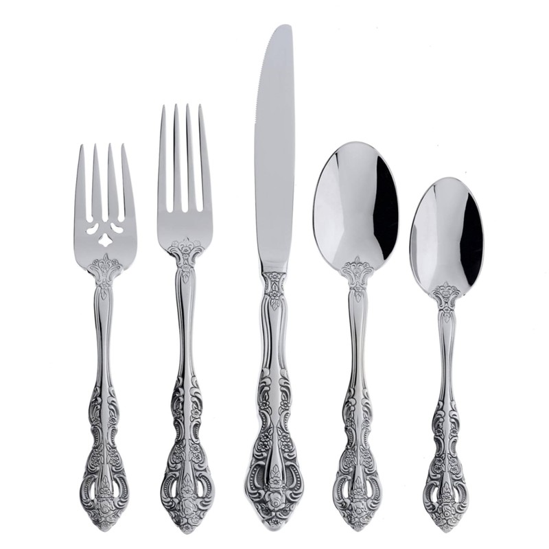 - 20-piece flatware set with service for 4. Set includes 4 each: place knife, place fork, place spoon, salad/dessert fork, and teaspoon