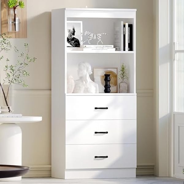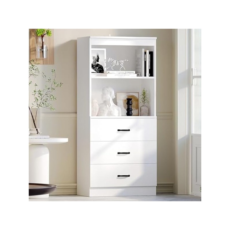 oneinmil 55" H 5-Tier Bookshelf with 3 Drawers, White Bookcase with 2-Tier Open Shelves, Tall Book Shelf with Storage Space, Wooden Storage Cabinet for Living Room, Bedroom, Kitchen, Office
