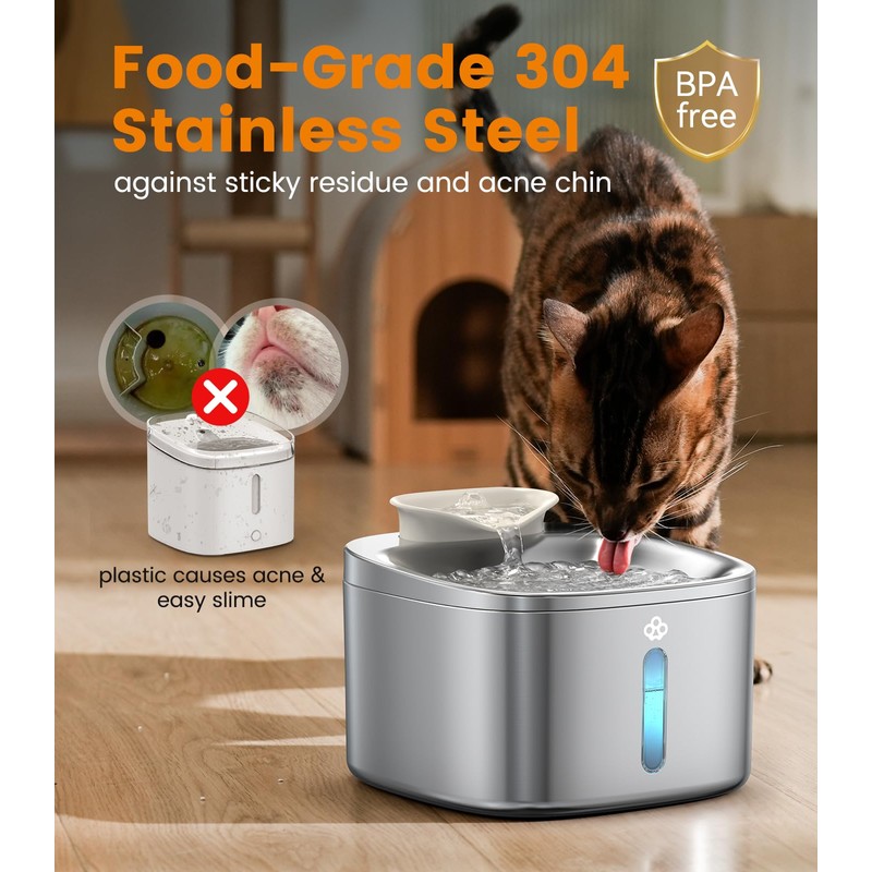 - Premium 304 Stainless Steel for more Health and Safety: Are you tired of frequently cleaning the sticky plastic? Our metal cat fountain is made of premium 304 stainless steel, easy to keep clean and dishwasher safe. Stainless steel keeps you feline friend away from cat acne compared to plastic alternatives. Oneisall pet water spout fountain promotes a healthier and more clean drinking water for your pets