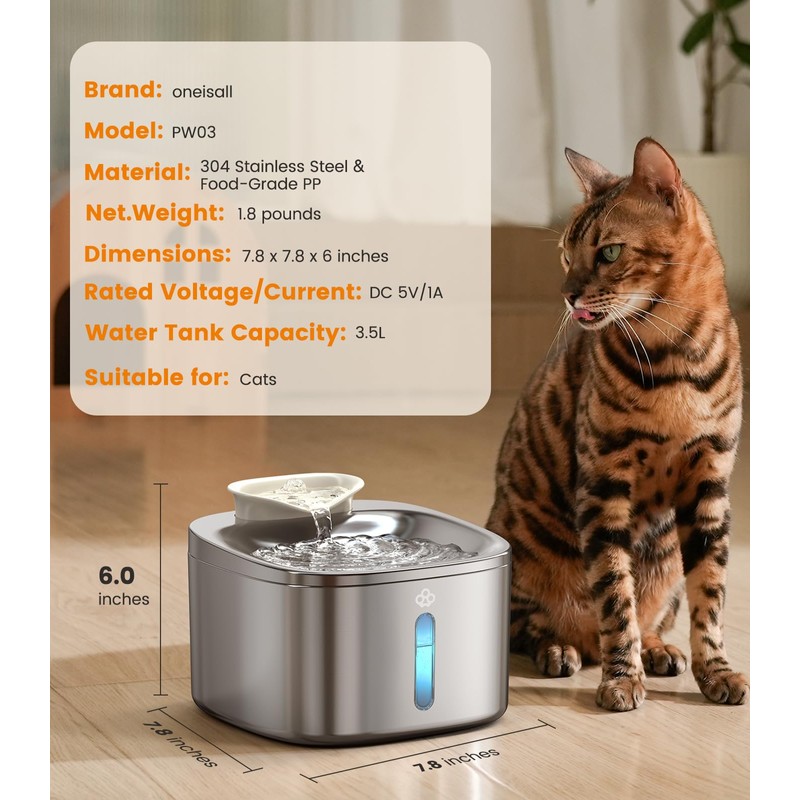 oneisall 3.5L/118fl oz Stainless Steel Cat Water Fountain with 2pcs Filters
