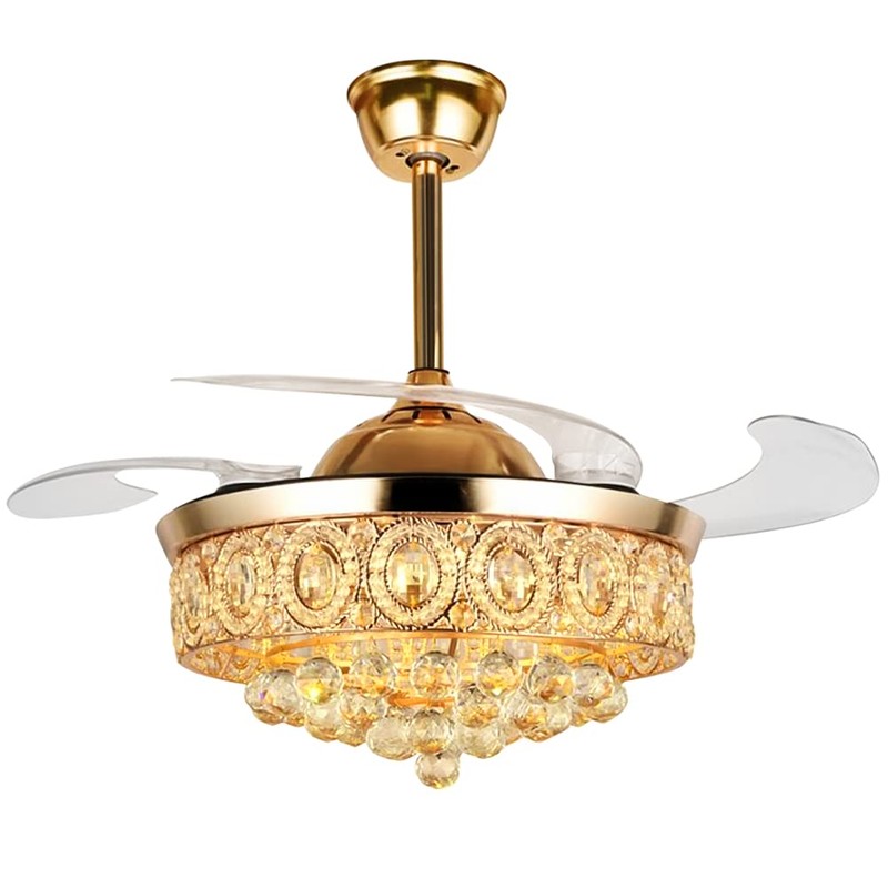 ONELLH 42inch Retractable Crystal Ceiling Fan with Lights, Invisible Chandelier Ceiling Fan with Remote Control 3 Colors Change Silent Fandelier for Living Room Bedroom