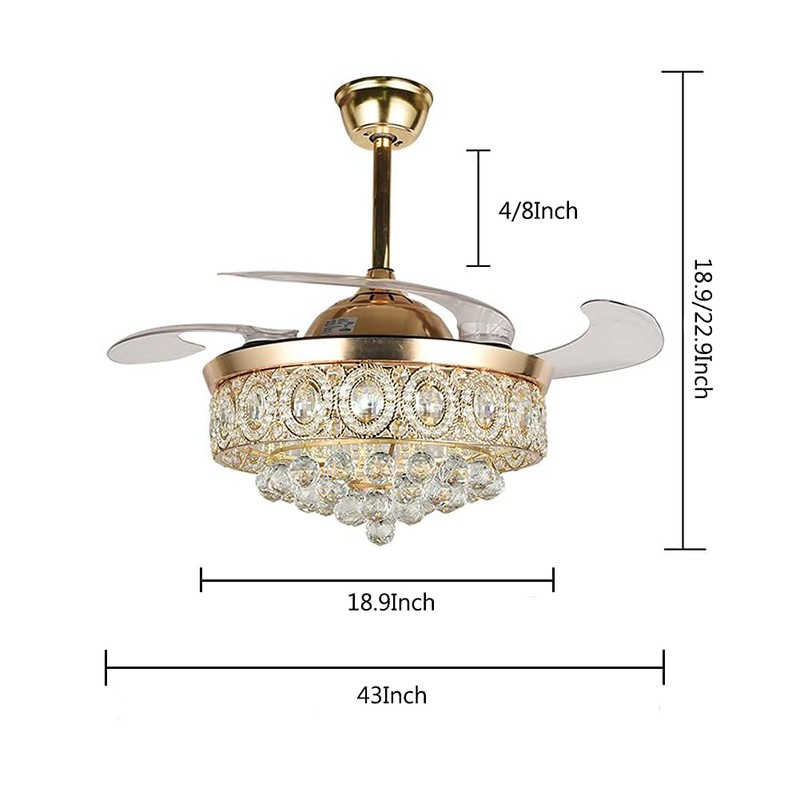 - [Size]: Crystal ceiling fan with chandelier 4 retractable blades.The blades will automatically open and retract. Diameter 42" when open, 19" when closed. 4"/ 8" down rods included. Suitable for different ceiling heights.