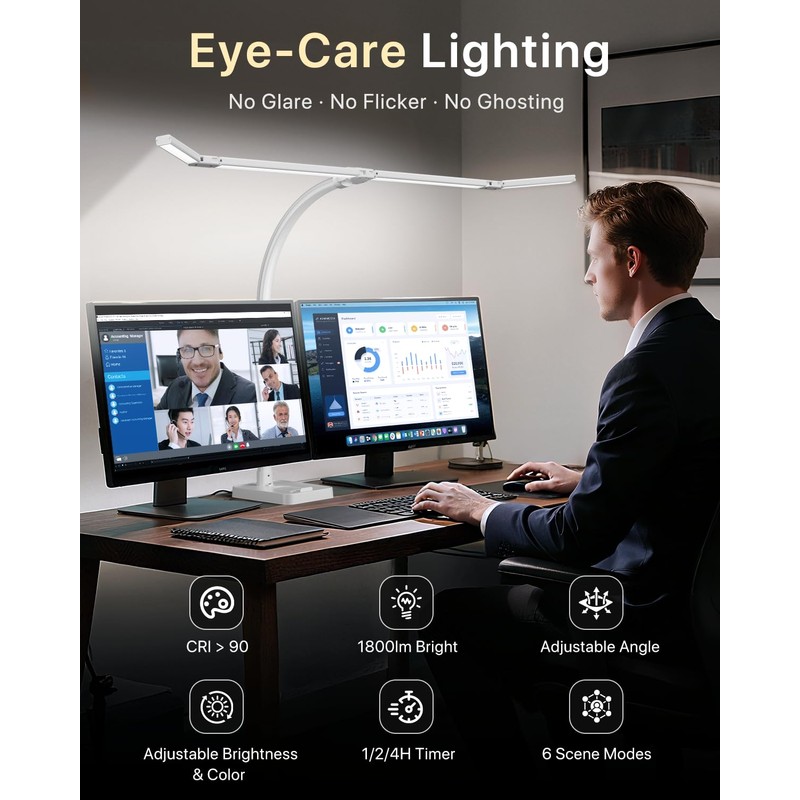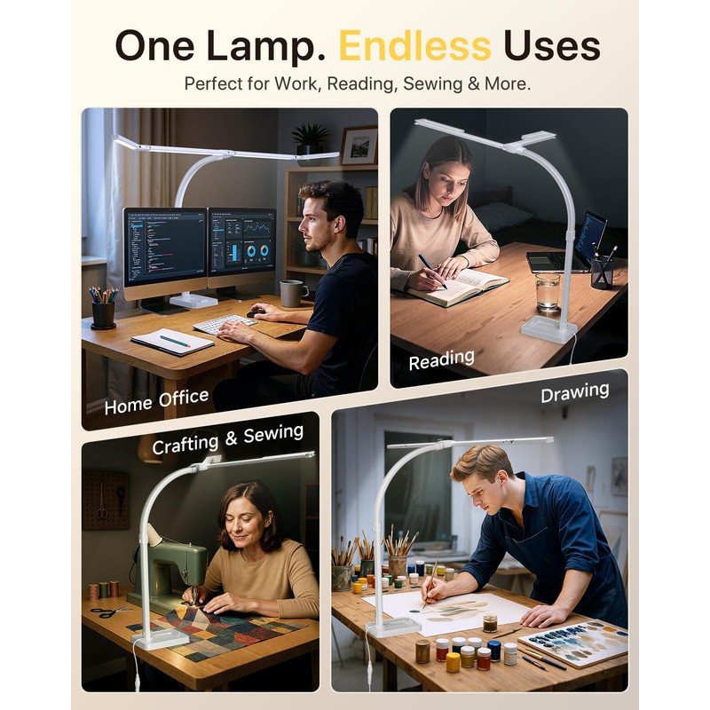 - Ultra-Wide & Super-Bright Light Bar: This 42-inch LED desk lamp features a 4-segment architect-style light bar with independently rotatable panels. Fold the segments inward for focused, task-oriented lighting—or swivel them outward to blanket up to 80 inches of workspace in wide, even illumination. With 1800 lumens of flicker-free brightness, it’s ideal for dual monitors, puzzle tables, sewing setups, and creative workspaces in home offices or dorms.