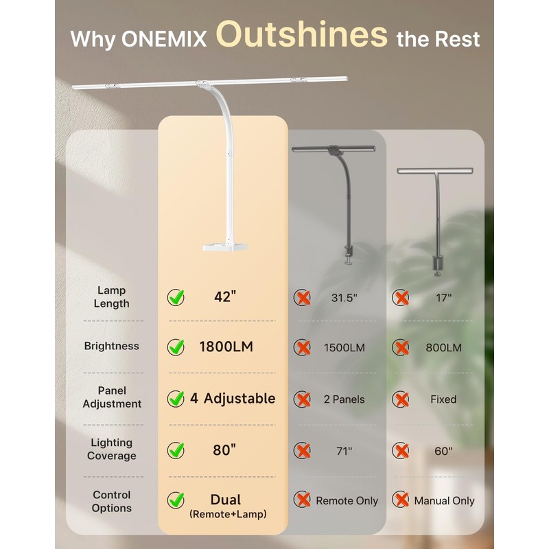 ONEMIX 42" LED Desk Lamp for Home Office, Eye-Caring Desk Light with Adjustable 4-Segment Bar, 1800LM Bright, Remote, Architect Table Lamp with Base for Dual Monitors, Reading, Study, Workbench(White)