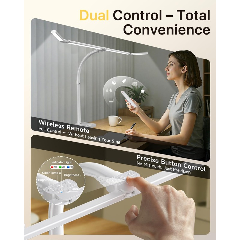 - Remote & Button Control Options: Control the table lamp your way—via built-in buttons or the included wireless remote. Adjust brightness, switch color temperature, set 1/2/4-hour timers, or instantly activate one of 6 preset modes: Work, Game, Study, Relax, Night, and Mother & Baby. Smart, simple, and versatile.