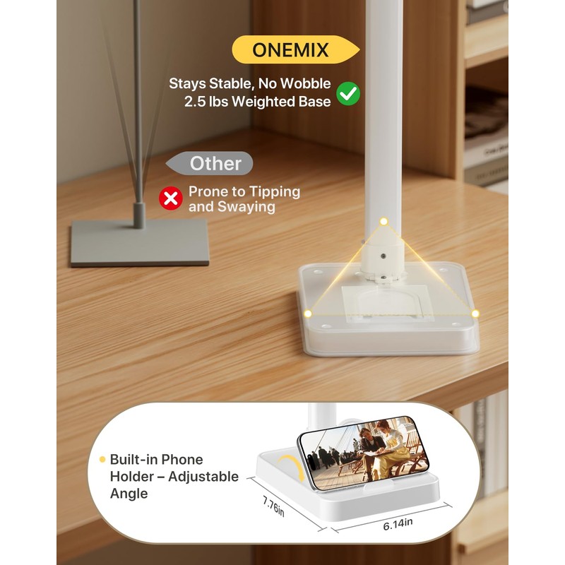 - Flexible Stand & Solid Weighted Base: The 27.7-inch support stand bends up to 180°, so you can position light with ease—whether you're working on dual monitors, sketching, or crafting. The sturdy 2.5 lb weighted base delivers rock-solid stability without wobble or tipping, and includes a built-in phone holder for hands-free viewing—perfect for desks, countertops, or any flat surface in your home office, bedroom, or creative space.