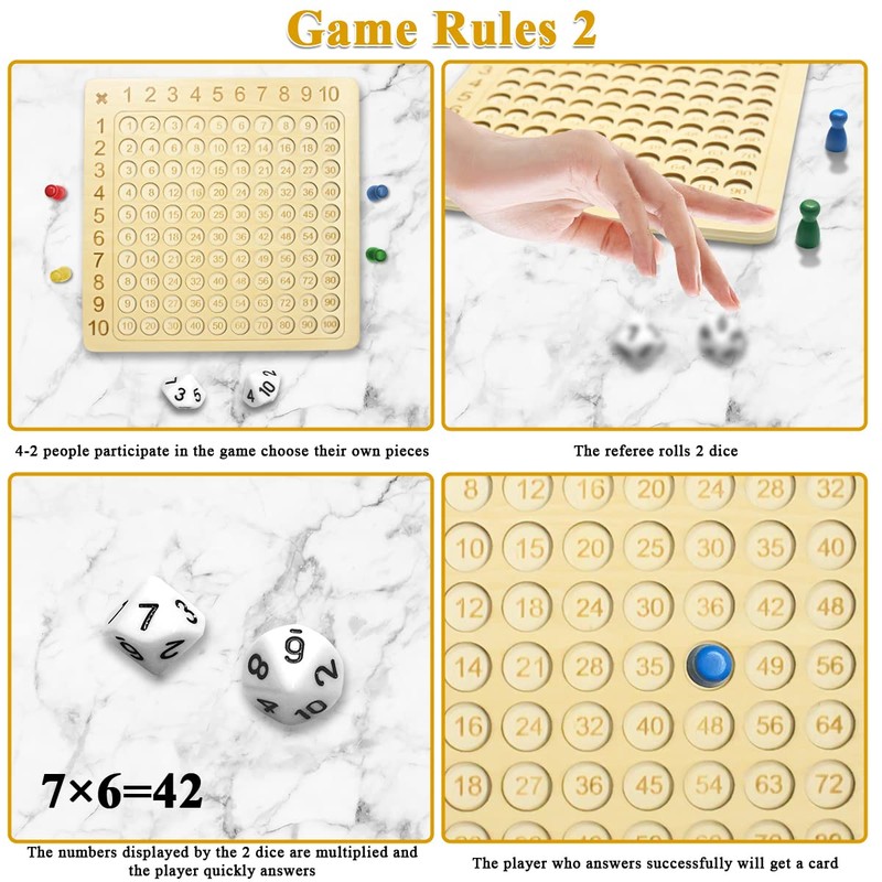 - Description of the game: There are two ways to play the Montessori toy multiplication board. 1:Draw cards and find the answer quickly on the multiplication tableau, the first to find the answer wins a card. There are a total of 100 cards and the side with the most cards wins (2-4 players can play).