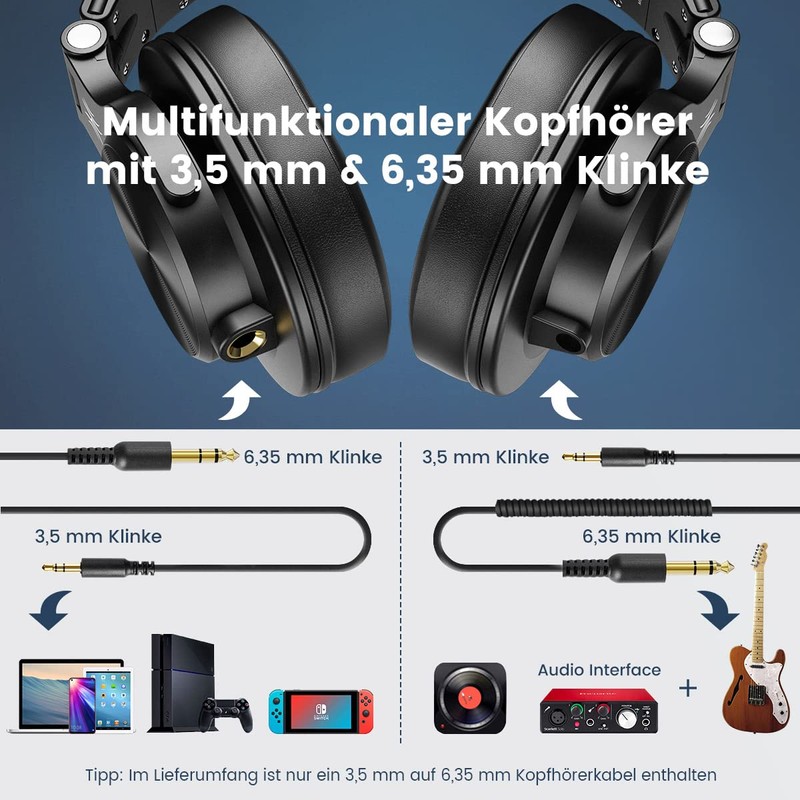 - High wearing comfort: OneOdio DJ headphones are made of ergonomic material that adapts to the skin and is flexible and breathable. The over-ear cup has a width of 95 mm. The headphones can be easily folded, easy to carry.