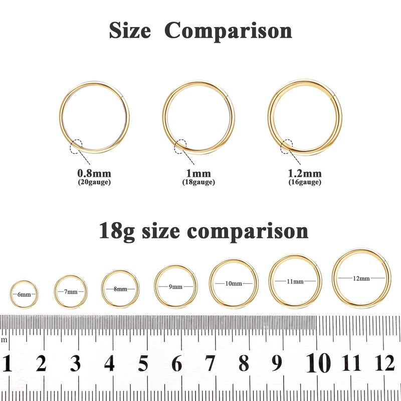 - 【MULTIPLE SIZEt】: Cute nose rings hoops include different gauge size 20 gauge (0.8mm); 18gauge (1mm); 16 gauge (1.2mm) . Inner of the hoop in 6mm/7mm/8mm/9mm/10mm/11mm/12mm. You can choose the best size based on your nose holes.