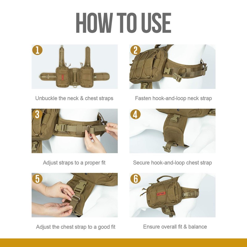 - 【OneTigris HOPPY CAMPER Doggy Backpack 2.0】Size Small: 14"-21"/535-53cm (neck), 20"-27"/51-68cm (chest), 9"/23cm (back); Net weight: 13oz/369g; 2 adjustable straps fits for medium & large dog