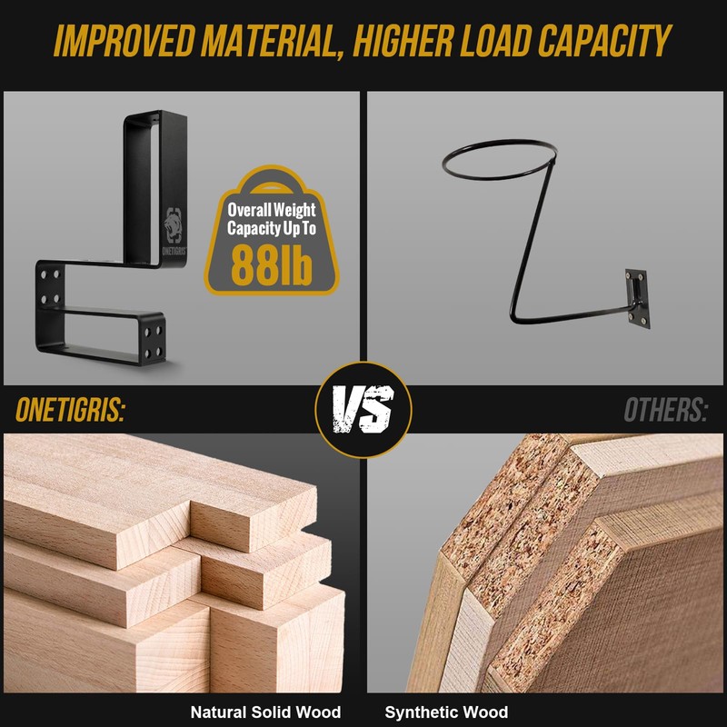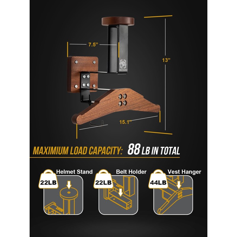 - Heavy-duty Load Capacity: OneTigris motorcycle Helmet holder wall mount can hold up to 88lbs, making it a sturdy and reliable storage solution for your tactical airsoft gear. It has a helmet rack capacity of 22lbs, vest hanger rack capacity of 44lbs, and belt rack capacity of 22lbs, ensuring that your equipment is safe and secure