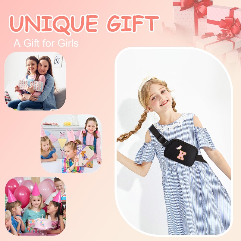ONETOALL Birthday Gifts for 4 5 6 7 8 9 10 11 12 13 Year Old Girls, Small Waist Fanny Pack, Crossbody Belt Bag with Initial Letter Patch, Nylon, Adjustable Strap, for Teen Girls