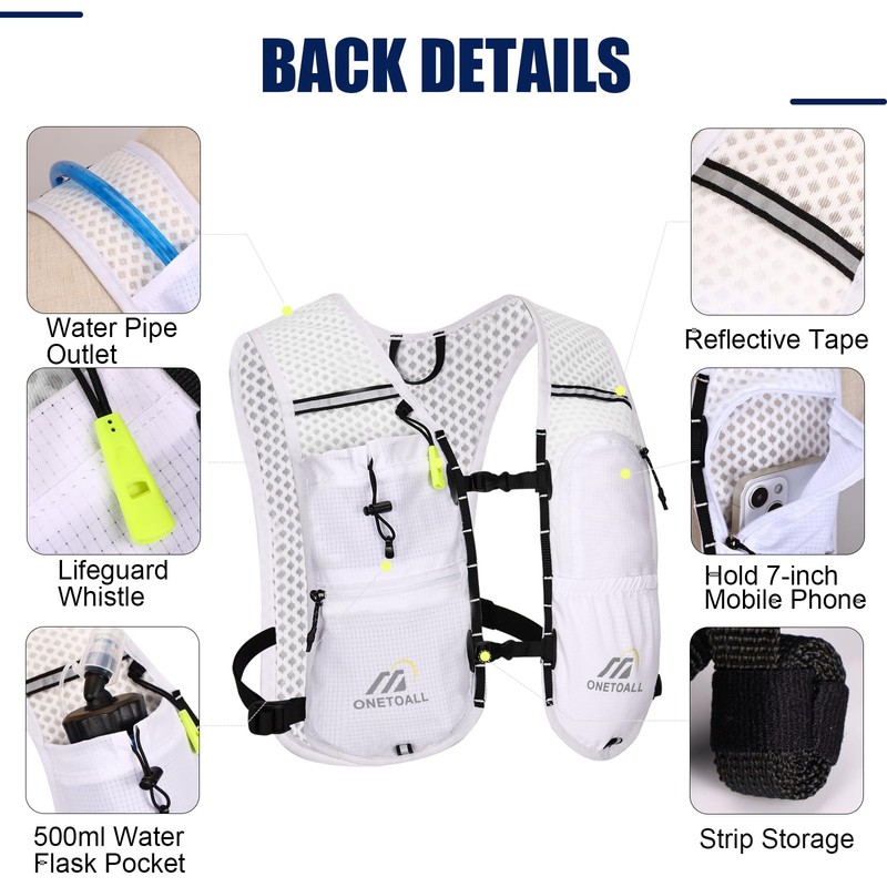 - WEIGHING ONLY 150G: ONETOALL running vest is made of the lightweight fabric, weighing only 150g (5.29oz), and can hold 2 liters water in the main compartment.