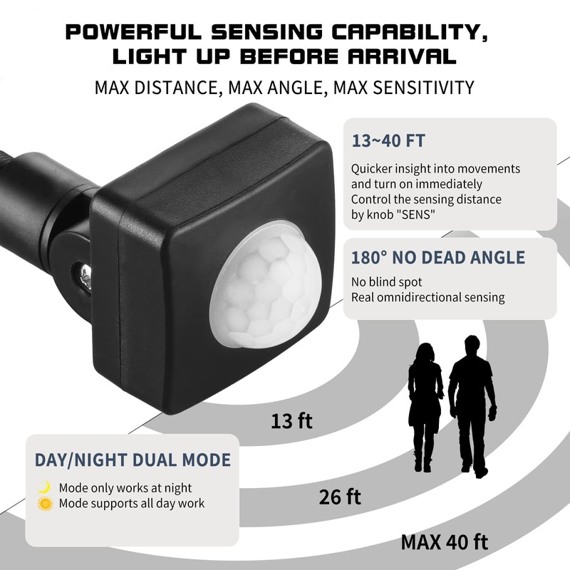 - 【High Sensitivity, Light Up Before Arrival】PIR motion sensor is suitable for day and night security lighting. Max detection distance 40 feet, the sensor installed in the corner can control the outdoor lights early on, detection range of 180 ° lighting without dead ends. The recommended mounting height of the sensor is about 6 - 9ft to get the best monitoring range and distance.