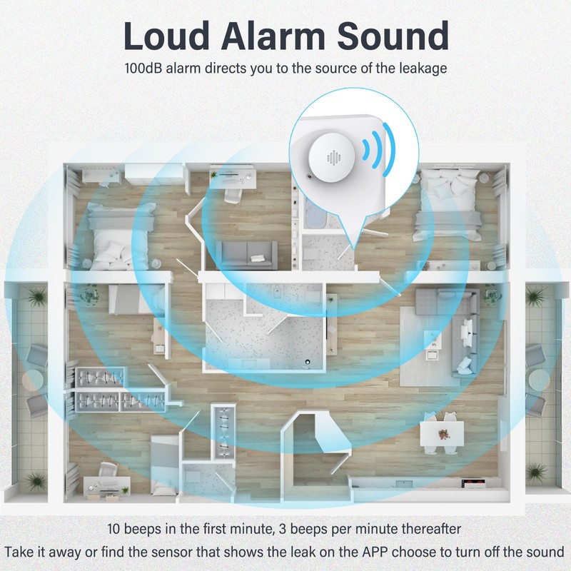 - LOUD ALARM: Once the water sensor is triggered, it emits a volume of up to 100dB - loud enough for everyone to hear it. Alarms can be stopped by mute the app or moving the sensor to a dry place.
