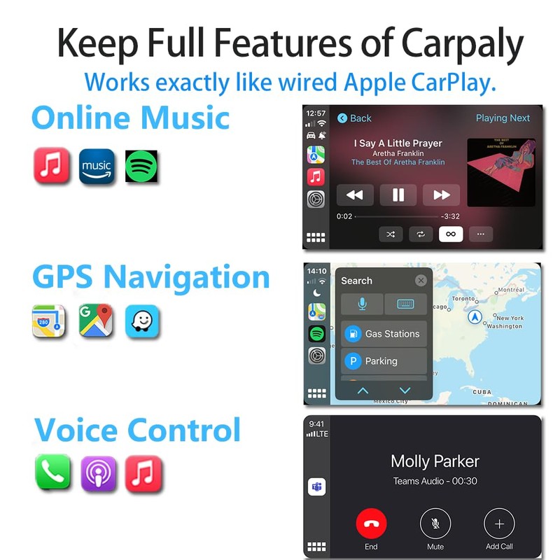 - 【Full CarPlay Function】This adapter has full Apple CarPlay functions, including maps, Siri, music, messages, etc. It is exactly the same as wired CarPlay except that it does not require the lightning cable. And, it supports voice control, steering wheel , touch screen and knob operation.