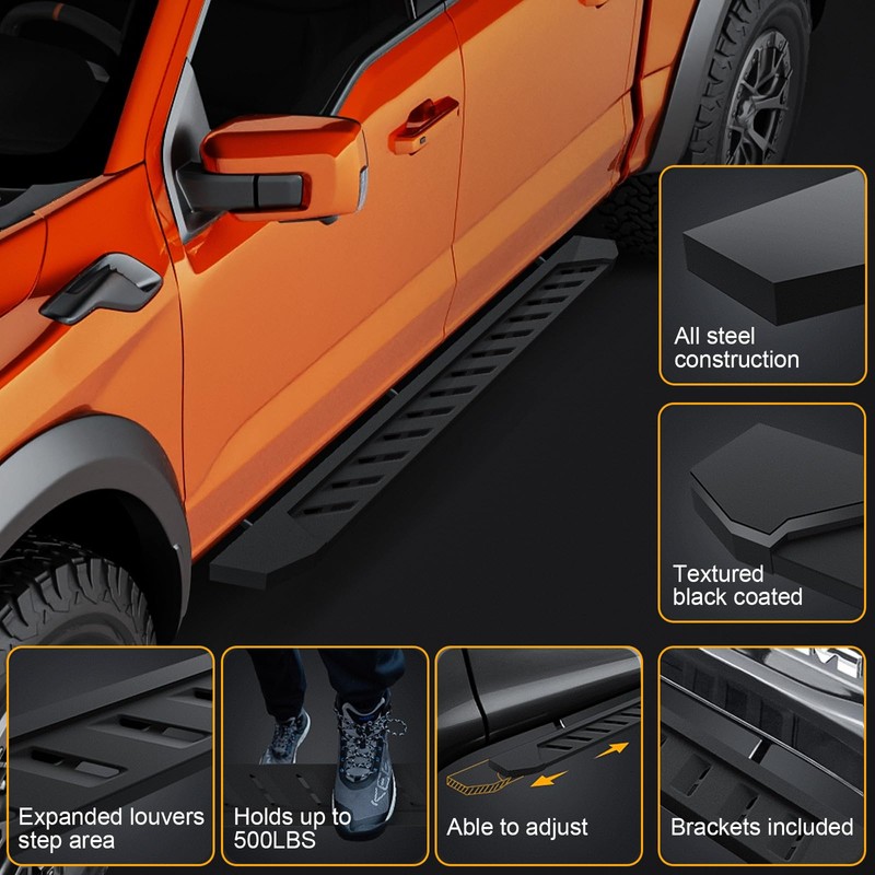 - ONINE Patent Design,Clutch Style Running Board Features a Rugged Steel Construction and Indented Louvers Along the Step Area for Maximum Traction, also Made to Drain off Rain,Dirt and other Debris.