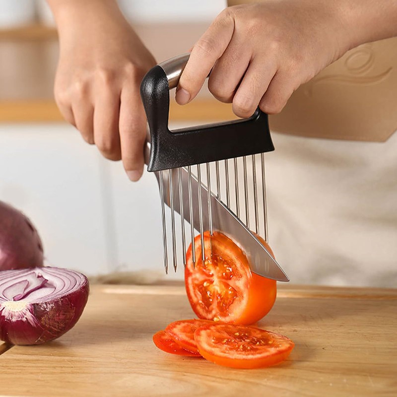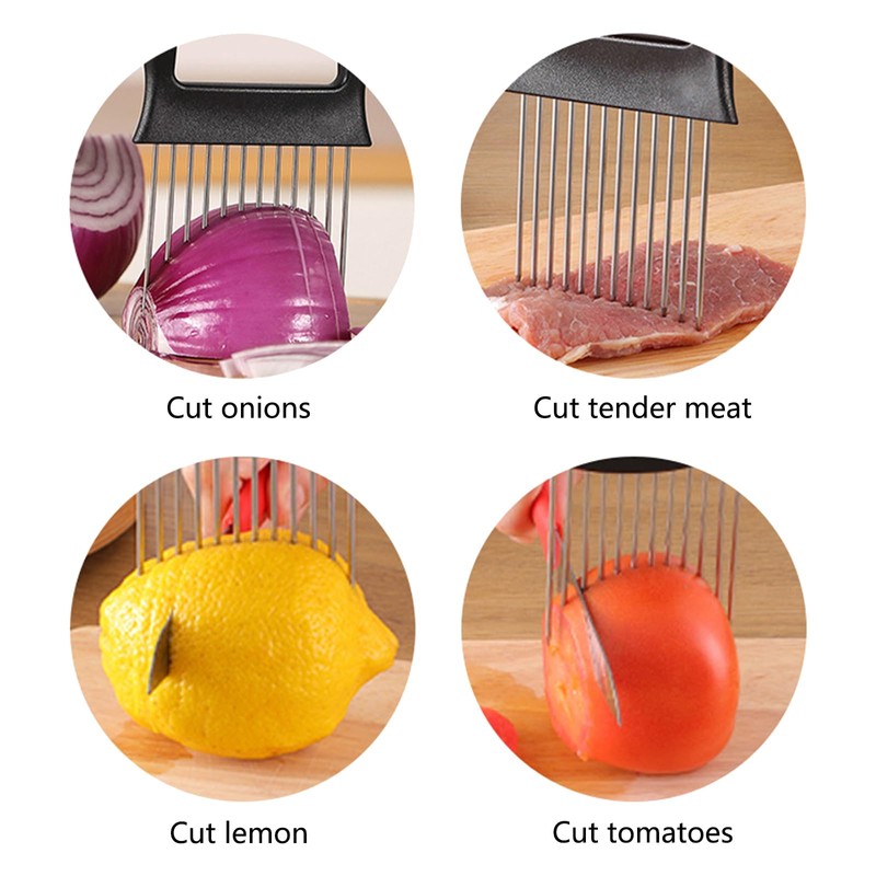 - Onion Slicer: Onion holder is designed with 12 long stainless steel forks that are sharp and prevent slippage, cutting onions, tomatoes, lemons and meat evenly.The Onion Holderr for slicing save a lot of time for slicing or chopping onions.