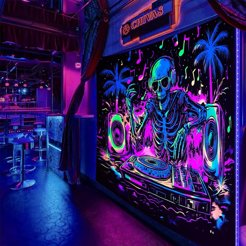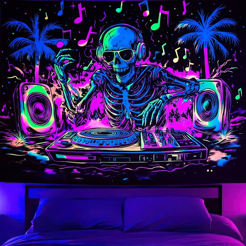 - UV/BLACK LIGHT REACTIVE: The skeleton tapestry wall hanging is made by UV reactive ink and advanced HD printing technology, which can glow gorgeously under UV/Blacklight in the dark. The vibrant colors and patterns come to life, making it a fun and interactive addition to party or event