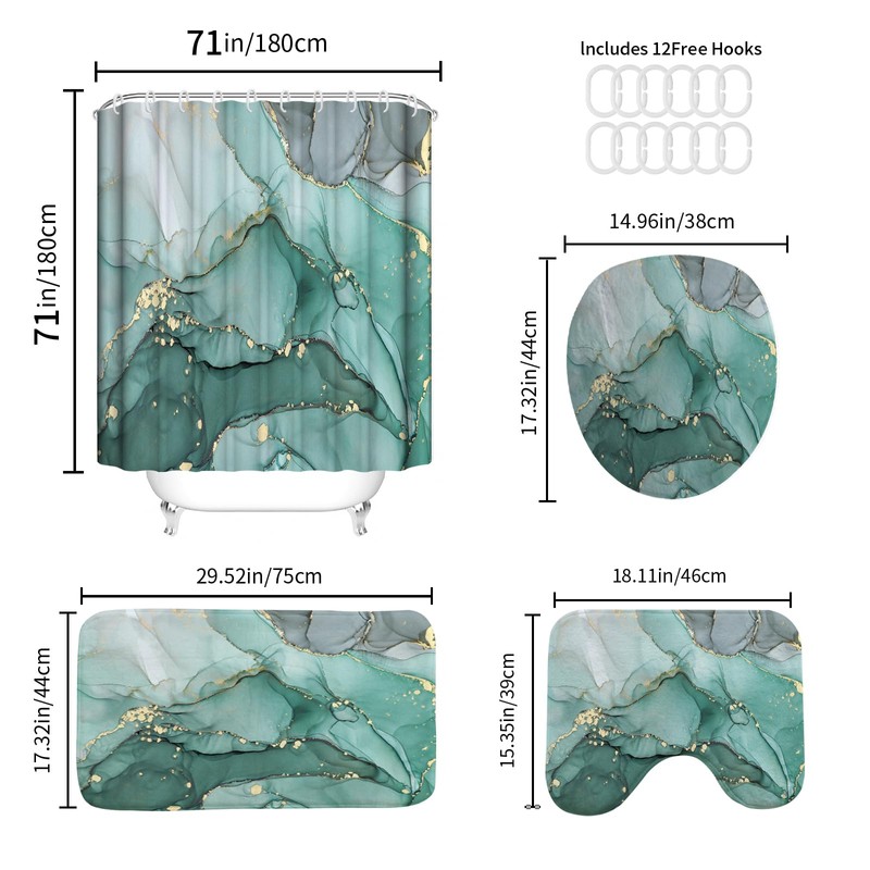 - 4-Piece Shower Curtain Set : 1 Turquoise luxury marble shower curtain, 1 bath mat, 1 U-shaped cushion, 1 toilet lid mat, 12 hooks. It is the ideal size to fit most people's bathroom needs. You can easily install any standard size shower/tub and work with straight or curved shower rods