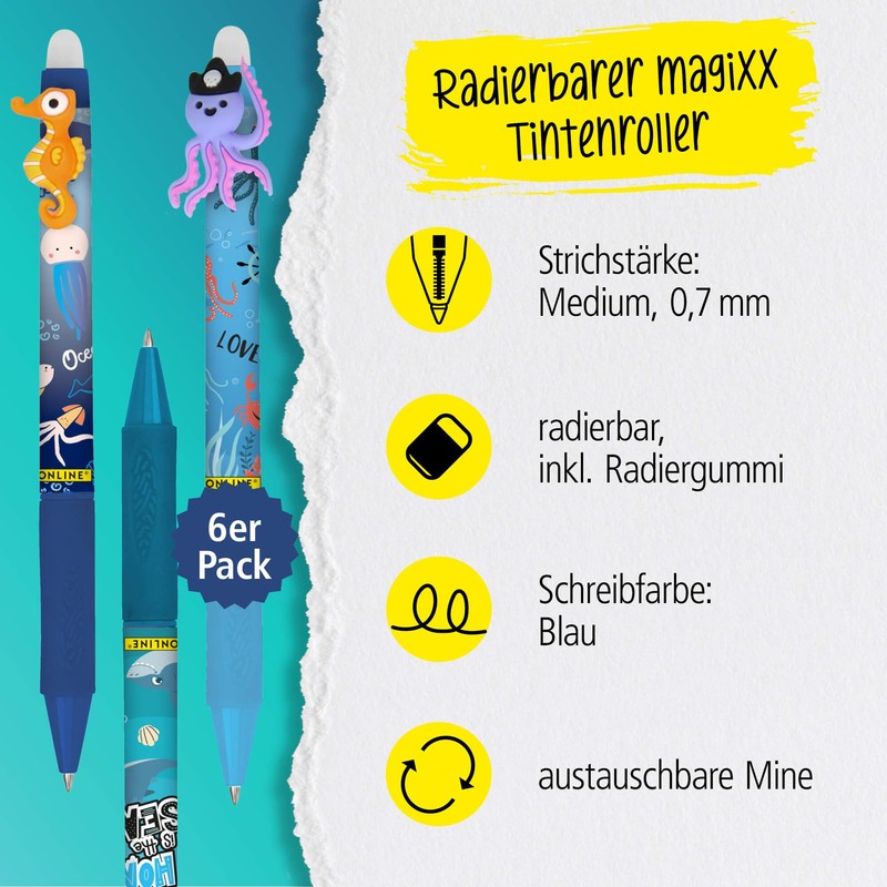 Online magiXX, 6 x Fun Sea World Erasing Pens, Gel Pens, Blue Erasable with 0.7 mm Line Width, Rollerball Pen for Learning to Write, Office, Compatible with Frixion Refill, Erasable Ballpoint Pen