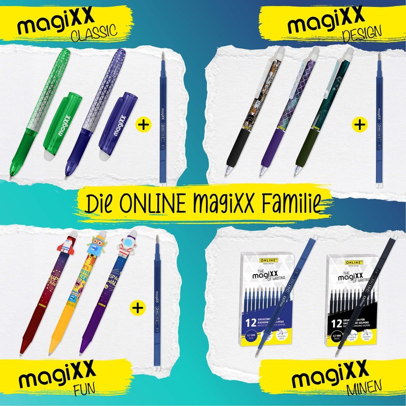 • Online anywhere: the erasable pens in the blue ink are ideal for learning to write and design. The set includes 6 colourful designs with small figures on the clip. Ideal as a small gift for school, children's birthdays and more.