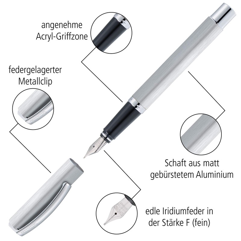 - Simple elegance: the online design fountain pen impresses with its high-quality, simple appearance, a robust aluminium surface and a spring-loaded metal clip. Together with the gift box, an ideal gift for lovers of clear shapes and precise technology - and guarantees an eye-catcher in the university or the office.