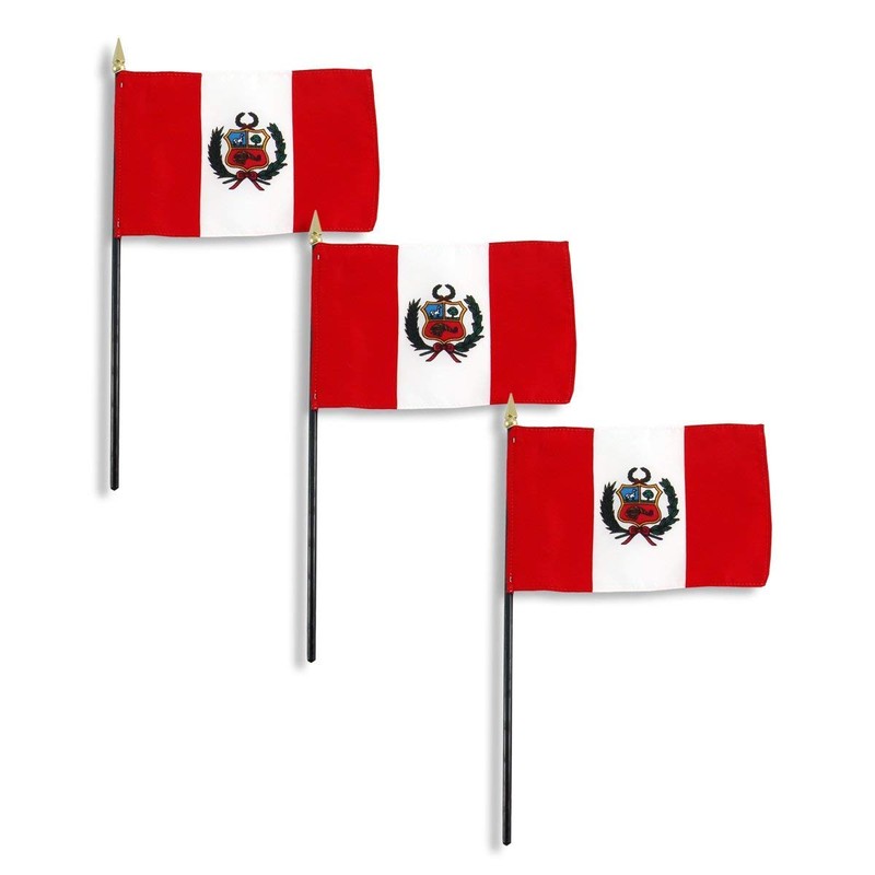 Peru flag 4 x 6 inch, mounted on a 10 inch plastic stick. Flag is made from polyester and printed in bright colors to make an attractive flag. Each flag is individually sewn around the edges.