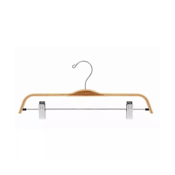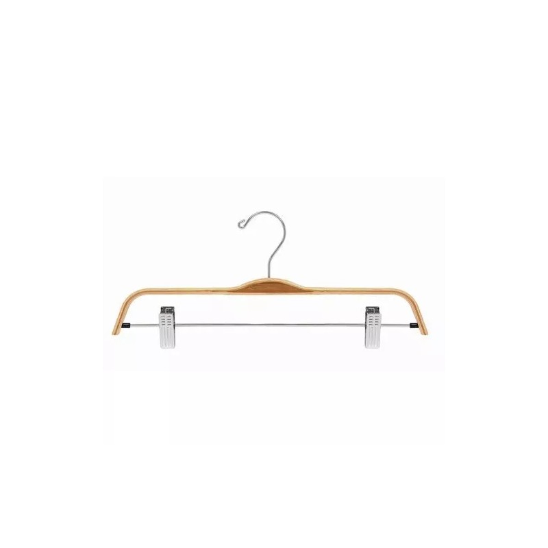 Earth friendly laminated bamboo hangers combine lightly colored bamboo shoulders with darker colored bamboo neck to create a strong yet elegant pant/skirt hanger. The hangers adjustable pant clips feature soft, non-marking clear rubber cushions to protect garments while keeping them in place. Bamboo hangers are made from a completely renewable resource and make an excellent "green" choice for any home or retail space.