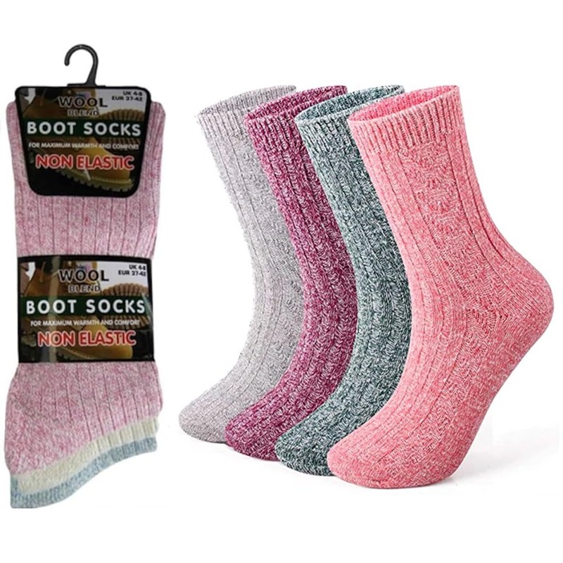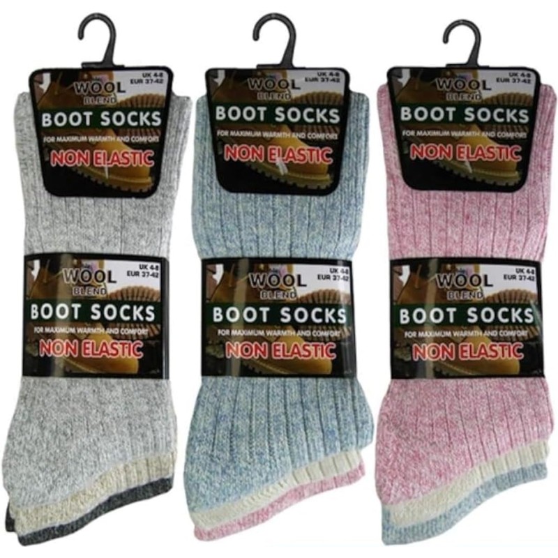 - These ladies 3 Pair pack, thermal non-elasticated socks are designed for optimal comfort and durability, featuring a 10% wool-rich blend that enhances softness and warmth. Ideal for cold weather, these socks provide reliable protection while maintaining a robust construction to withstand wear and tear.