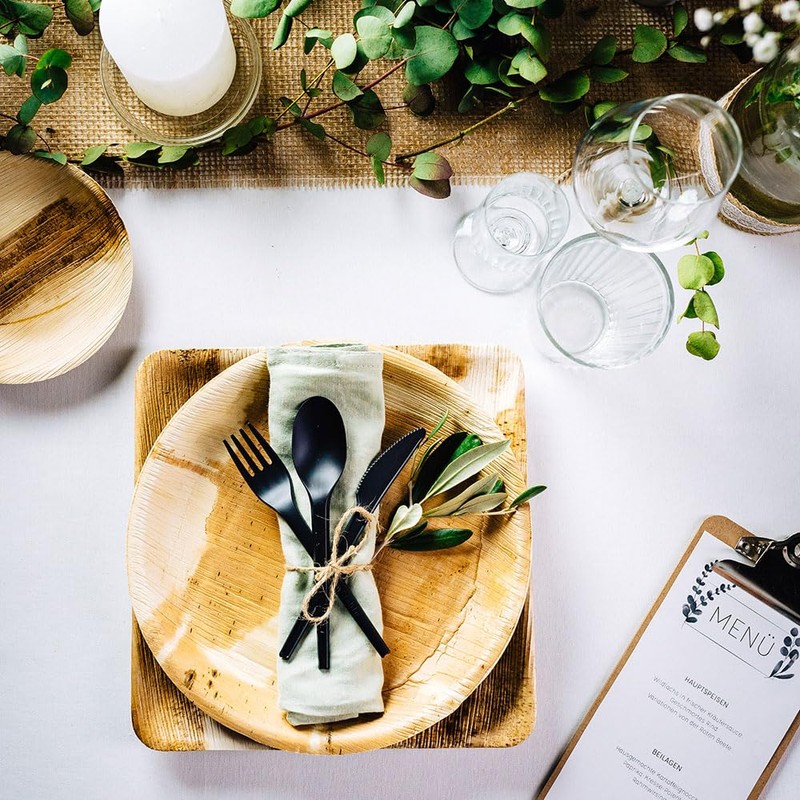 - Robust: the organic tableware is robust, waterproof, dimensionally stable, cut-resistant and more stable than ordinary paper plates and is therefore also suitable for greasy and sauce-containing food