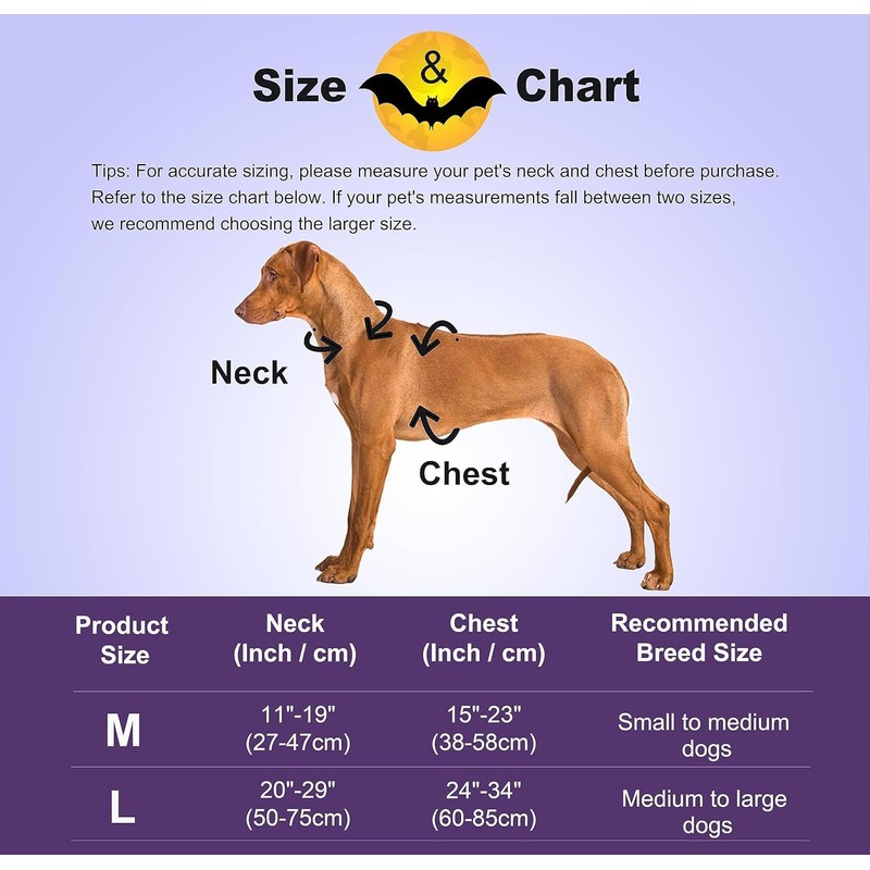 - "Versatile Size Range for All Breeds" Our pet costume bat wings come in sizes M and L. No matter the breed or size of your furry friend, you can find a comfortable and stylish fit. Create unforgettable memories with your dog this Halloween, whether you're strolling through haunted neighborhoods or capturing Instagram-worthy moments. Choose a costume that transforms your dog into a legendary figure and captures the essence of every cosplay event.